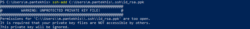 5. If you receive the following error, you need to change the permissions of the key by right clicking the key file going to Properties > Security > Advanced and removing all other user permissions.