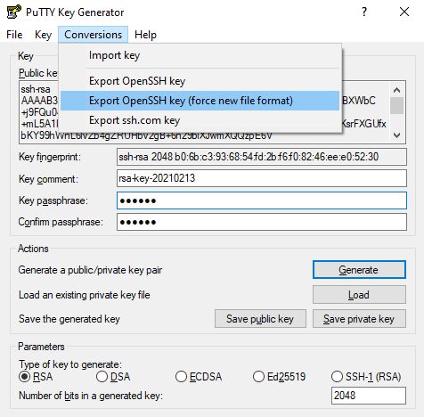 3. If you have created your key using puTTY you will need to save it using the openssh format. Open puTTYgen.exe and load your key by navigating to File > Load private key. Then under conversions select Export OpenSSH key( force new format).