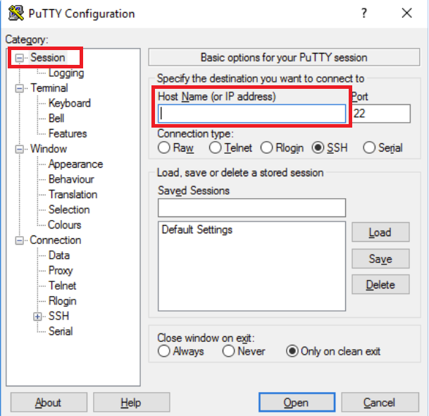 4. Enter login information in the Host Name box (e.g. username@hostname) and click Open